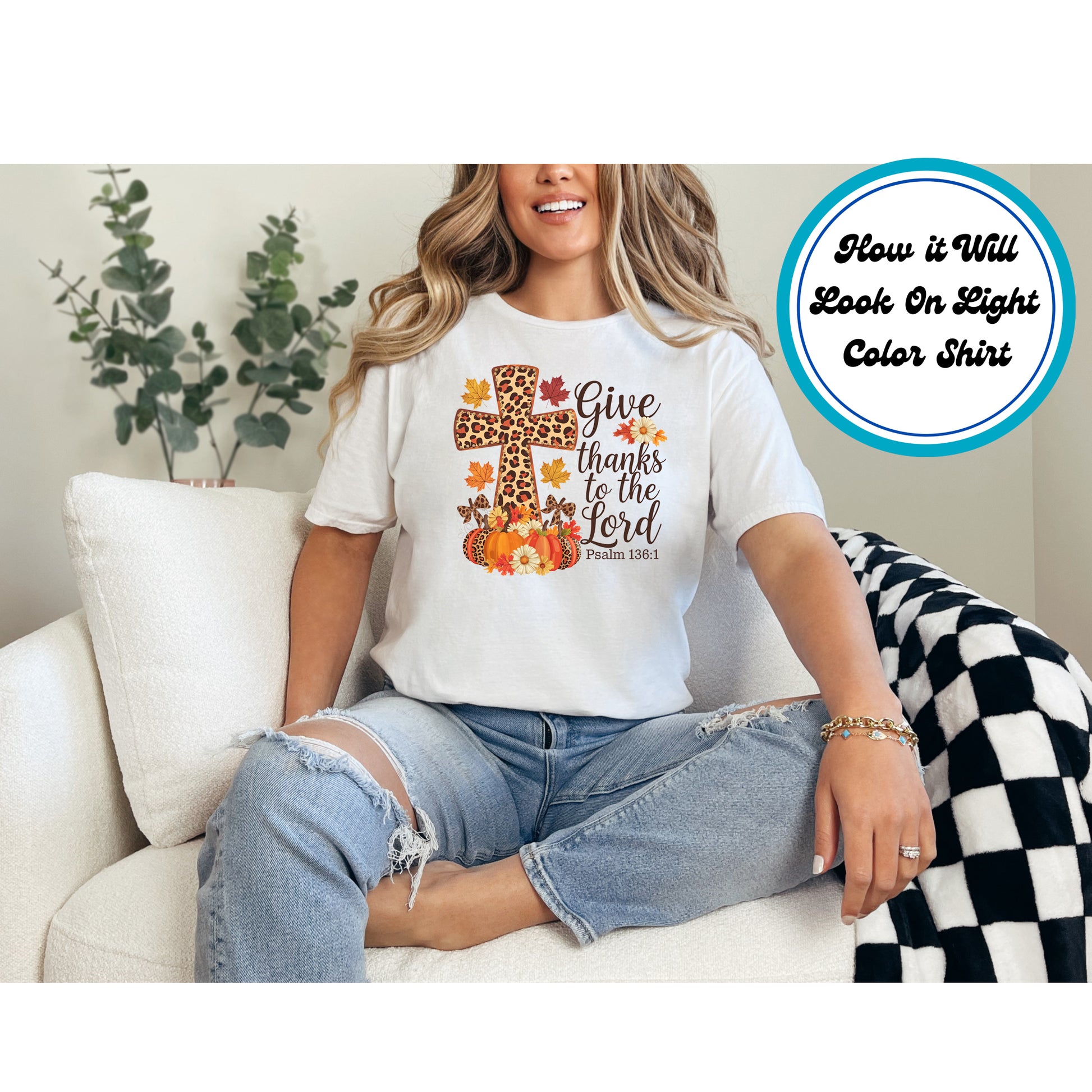 Thanksgiving DTF Transfer – Leopard Cross with Pumpkins and Give Thanks Scripture Ready to Press Iron On Heat Transfer for DIY Shirts 11294