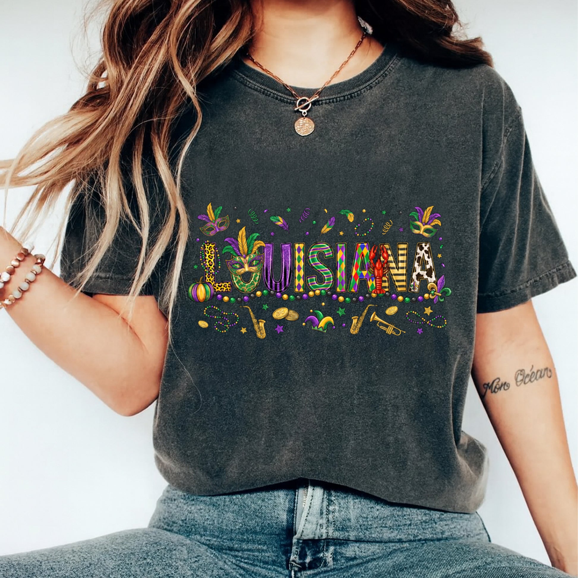 This ready to press Mardi Gras DTF transfer showcases a bold Louisiana word art graphic decorated with classic parade elements like masks, beads, coins, instruments, feathers, and vibrant purple, green, and gold accents. Perfect for Mardi Gras festivals, Louisiana pride outfits, parade crews, and carnival celebration shirts.