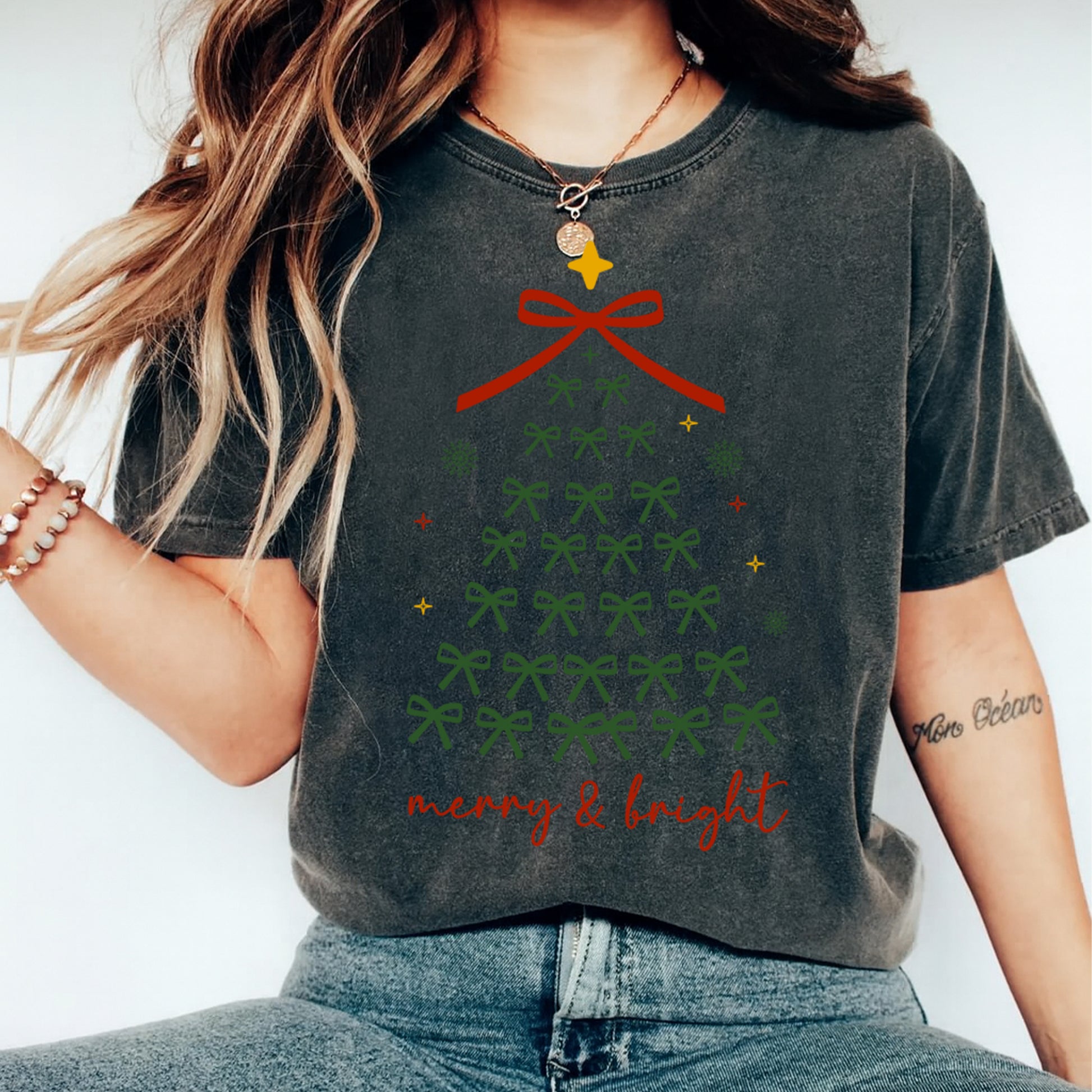 Christmas DTF Transfer – Merry & Bright Bow Tree Minimalist Ready to Press Iron On Heat Transfer for DIY Shirts 11779