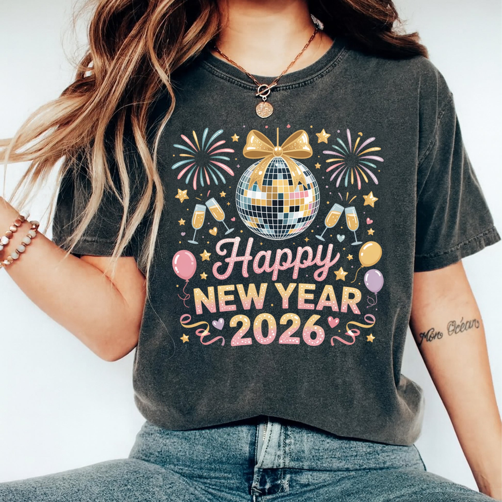 This ready to press New Year DTF transfer features a sparkling 2026 celebration scene with a metallic disco ball ornament, pastel fireworks, champagne glasses, balloons, stars, and a festive “Happy New Year” layout. The soft color palette mixed with shimmer elements creates a premium party aesthetic that’s perfect for event apparel, New Year’s Eve family outfits, and trending DIY holiday shirts.