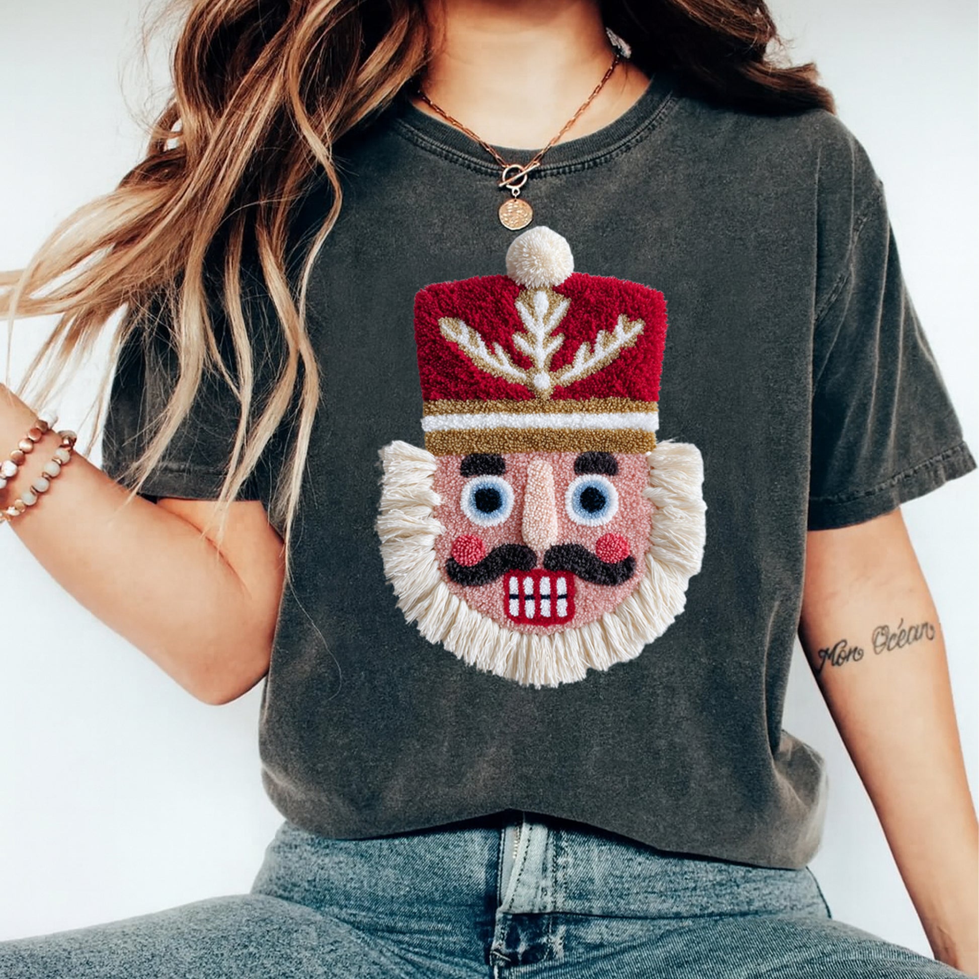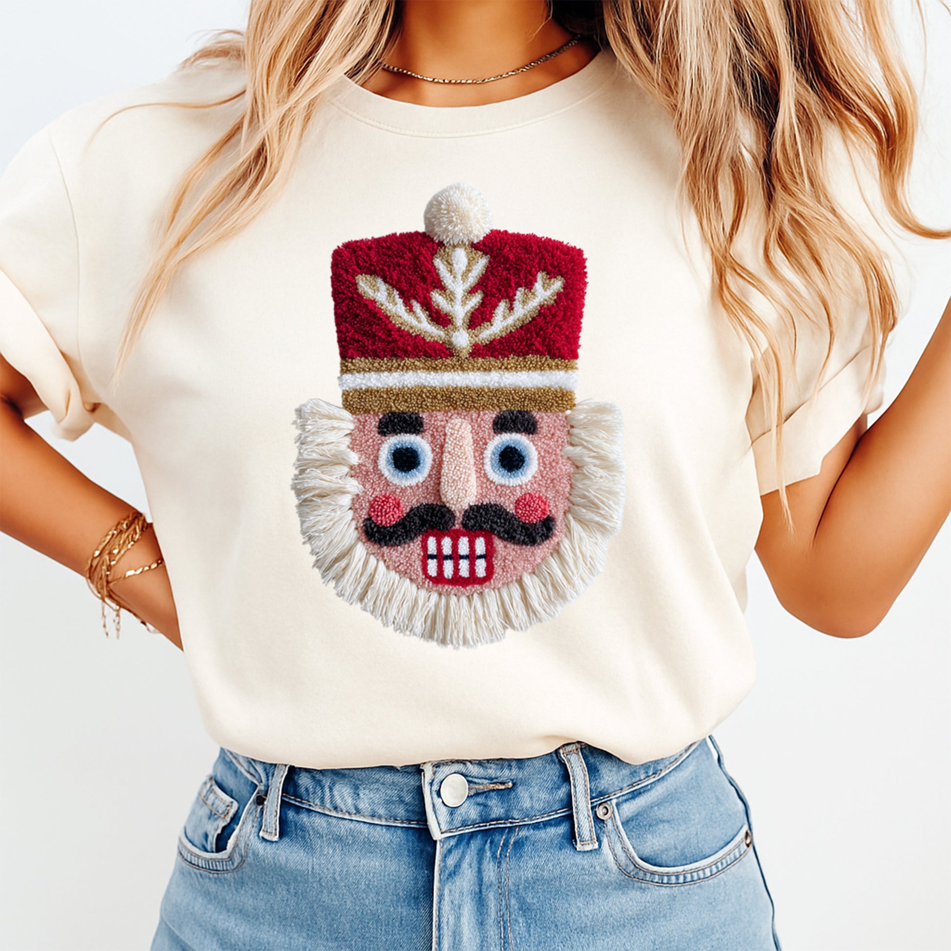 This ready to press Christmas DTF transfer features a handcrafted crochet-style nutcracker with tufted yarn textures, bold red soldier hat, stitched gold detailing, rosy cheeks, bright embroidered eyes, and a full fringe-style beard. The textured, handmade look gives this graphic a boutique, festive, and playful Christmas aesthetic perfect for holiday markets, winter events, and DIY Christmas shirts. This design is ideal for customers who love classic Christmas icons with a warm, fiber-art twist—perfect for small business holiday collections.
