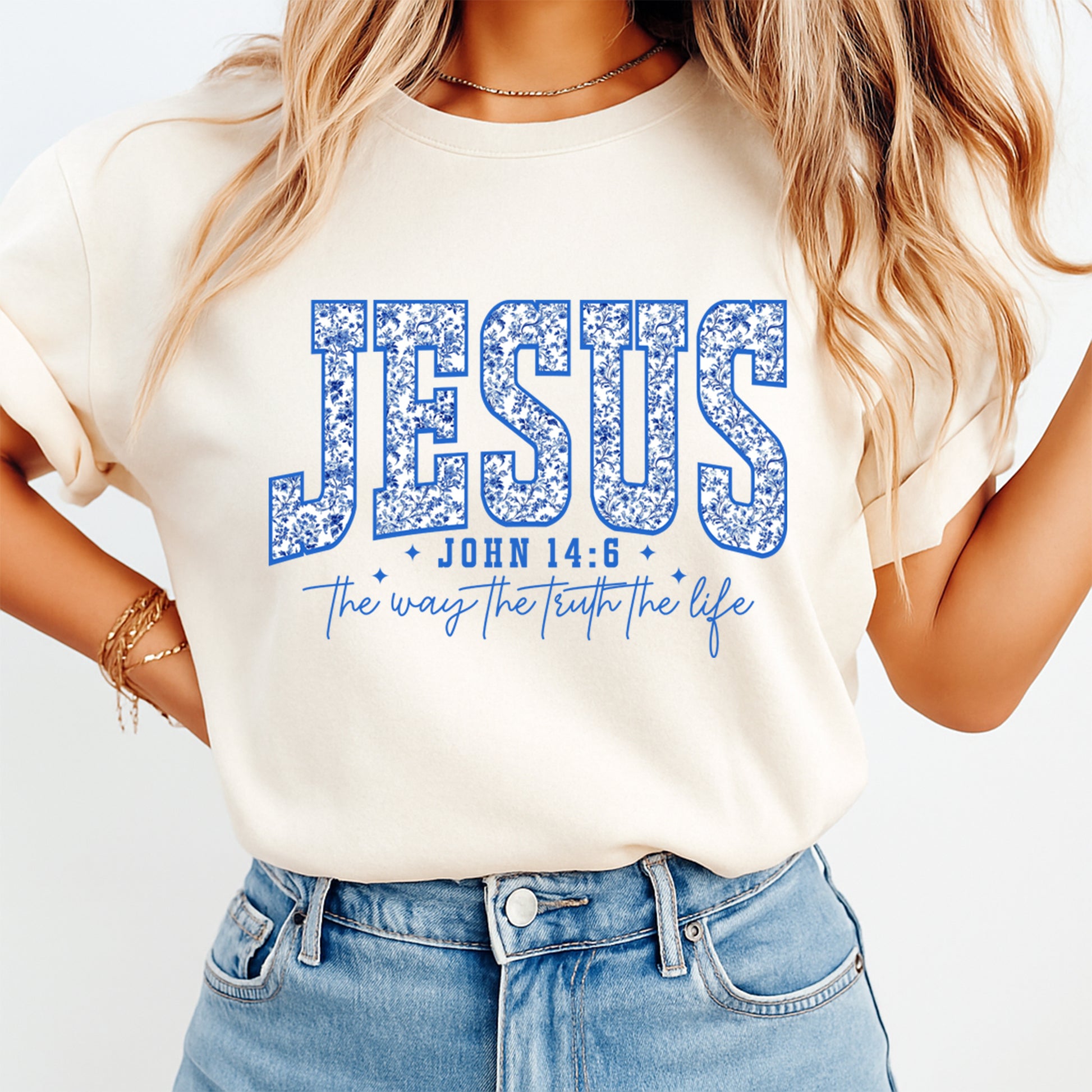 This ready to press religious DTF transfer features the exact scripture text “Jesus – John 14:6 – the way the truth the life” presented in bold floral-filled lettering with elegant handwritten script accents. The blue toile-style floral typography creates a timeless, faith-centered visual that works beautifully for worship wear, church events, inspirational apparel, and Christian lifestyle shirts.