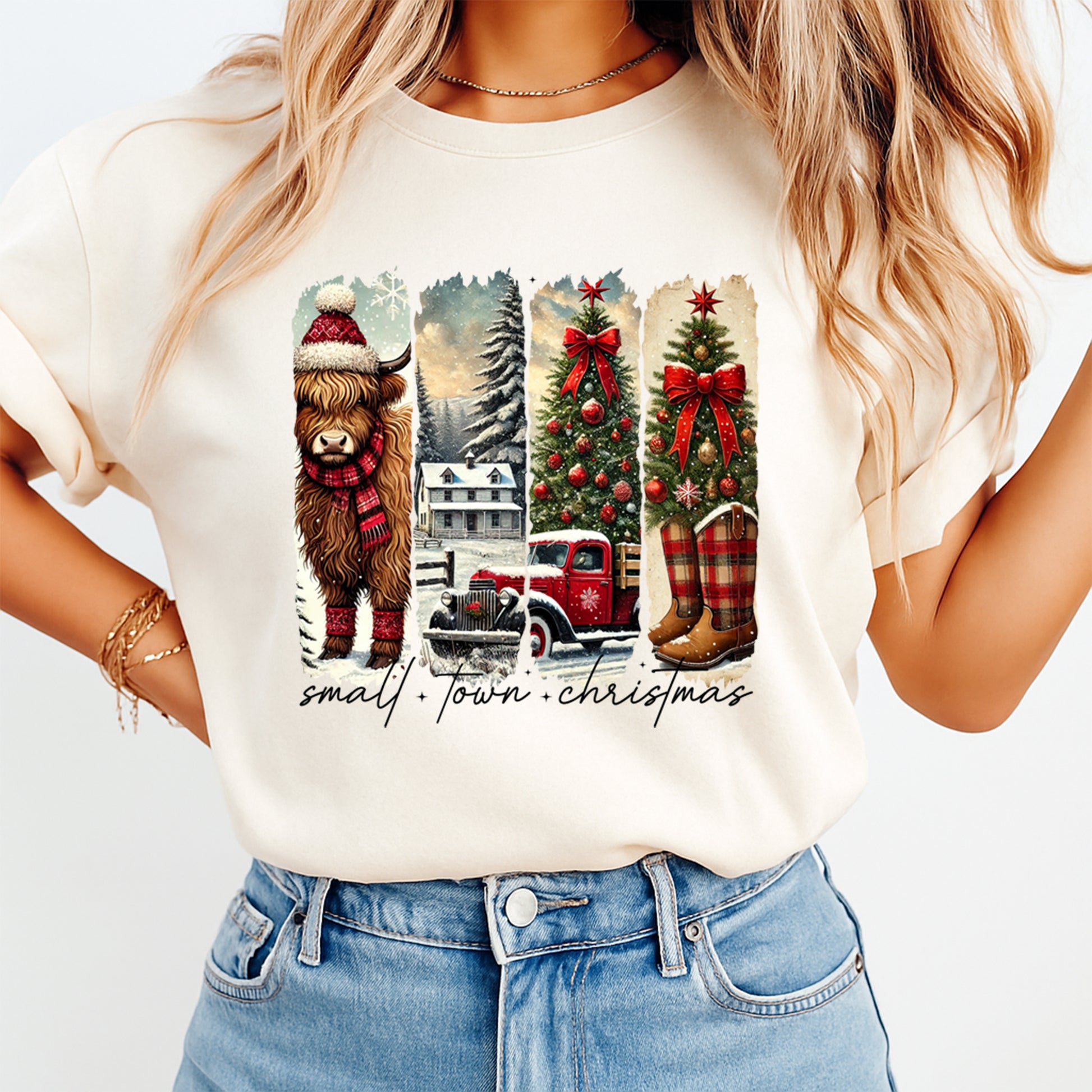 This ready to press Christmas DTF transfer features a cozy small-town holiday theme with a winter highland cow in festive accessories, snowy farmhouse scenery, decorated Christmas trees, a red vintage truck, and plaid winter boots. The artwork also includes the handwritten text “small town christmas” for a warm, nostalgic holiday vibe—perfect for boutiques, winter craft shows, and seasonal apparel drops.