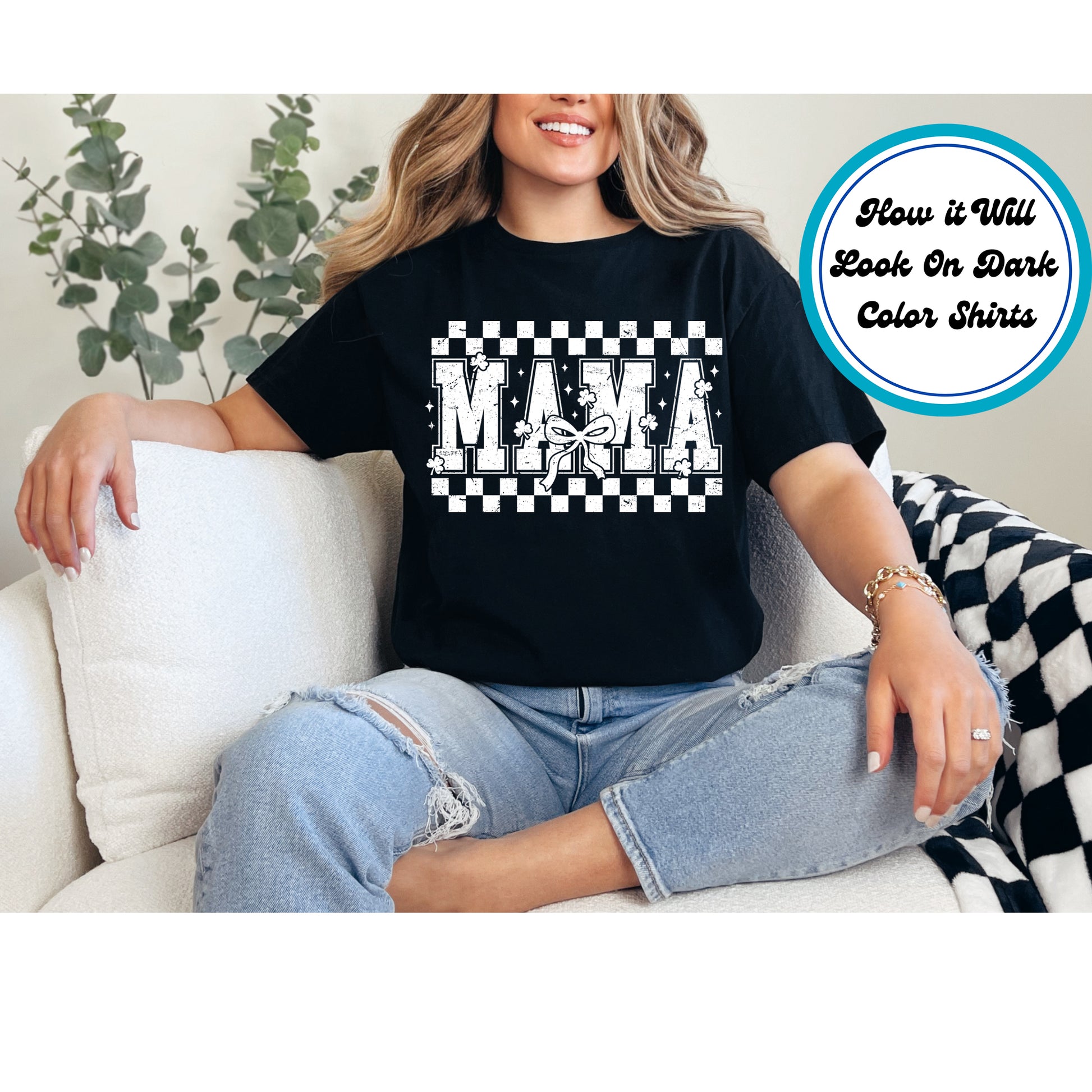 Product Description: This St. Patrick's Day Mama DTF Transfer is a stylish way to celebrate the luck of the Irish! Featuring bold varsity-style "MAMA" text, a classic checkerboard background, shamrock accents, and a cute bow detail, this design is perfect for festive moms who love St. Patrick’s Day. Ready to press and easy to apply!