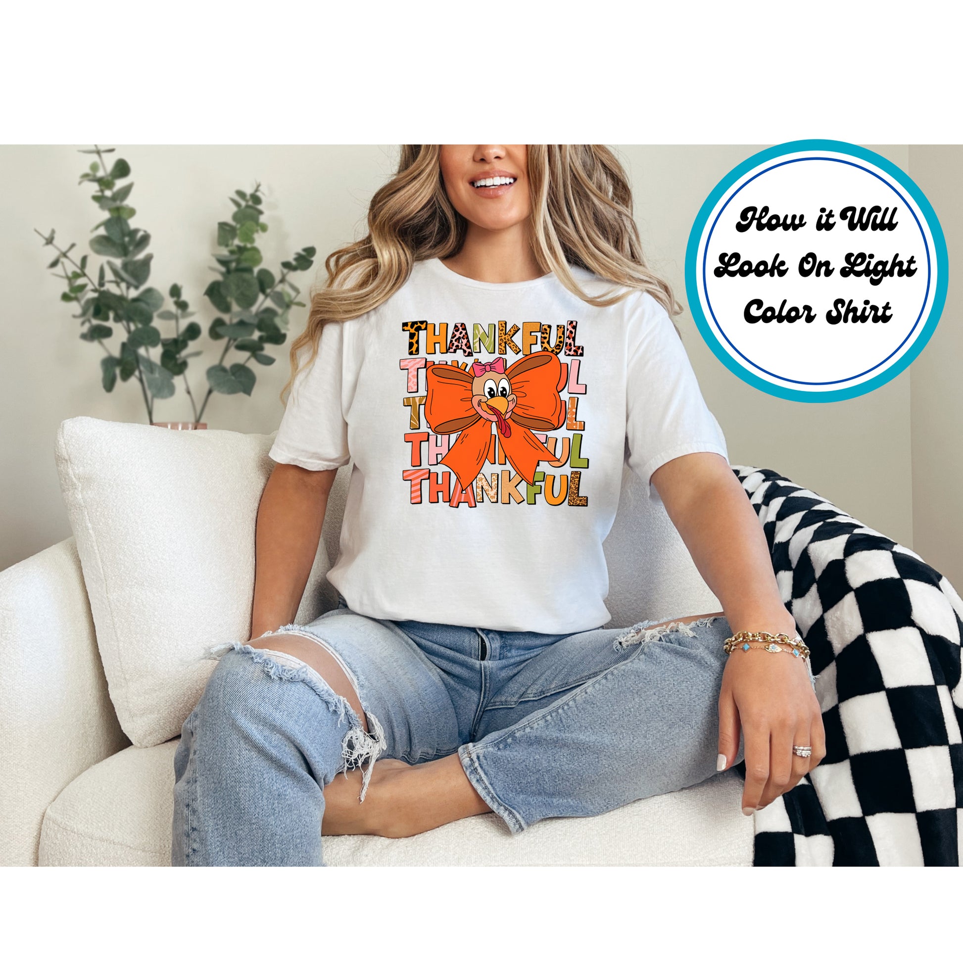 Thanksgiving DTF Transfer – Thankful Text with Turkey and Orange Bow Ready to Press Iron On Heat Transfer for DIY Shirts 11289