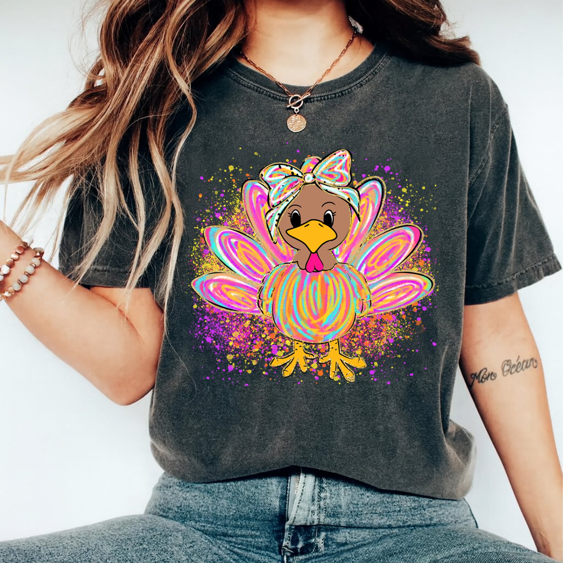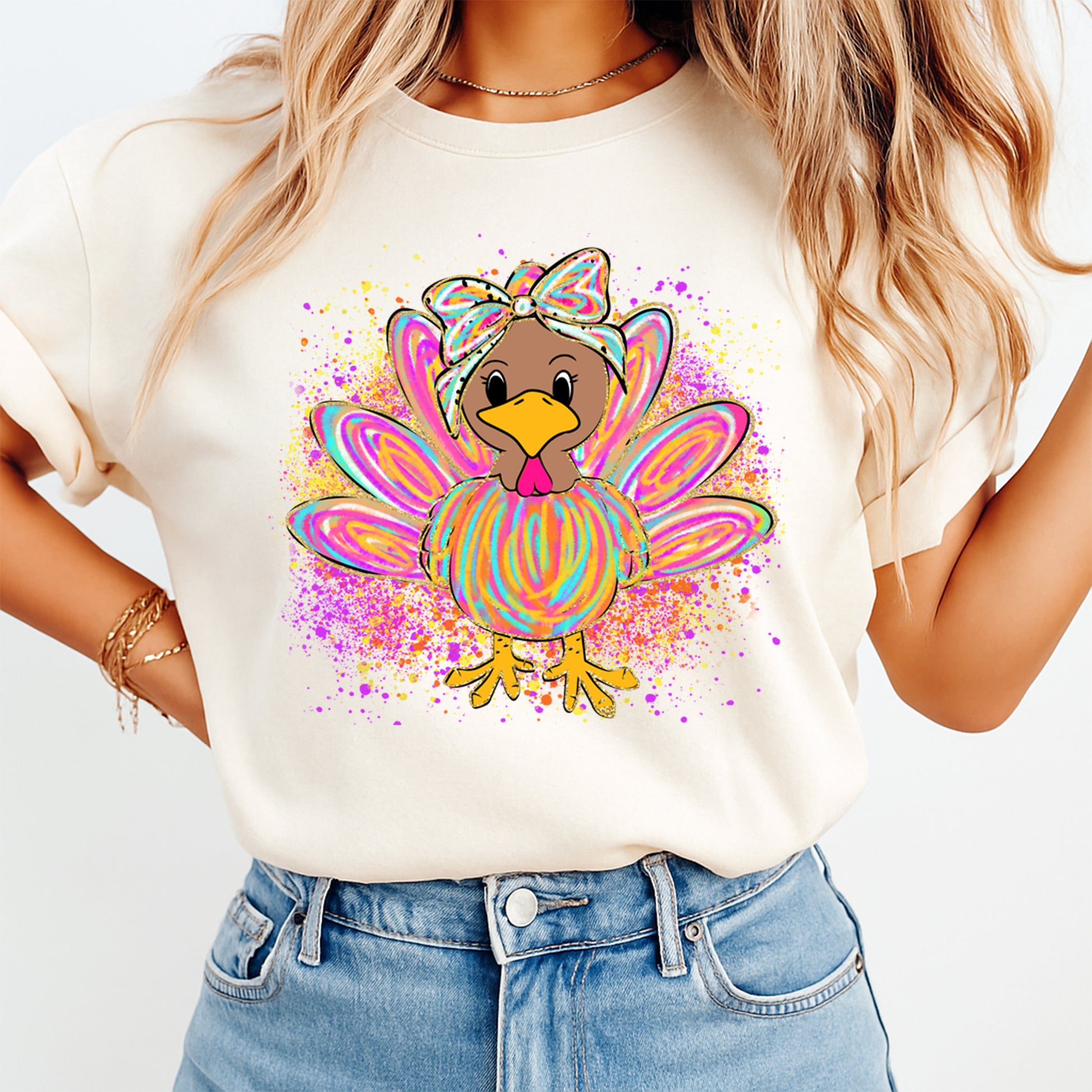 Thanksgiving Girly Bow Turkey Color Splash DTF Transfer – Ready to Press Iron On Heat Transfer for DIY Fall Shirts 12368