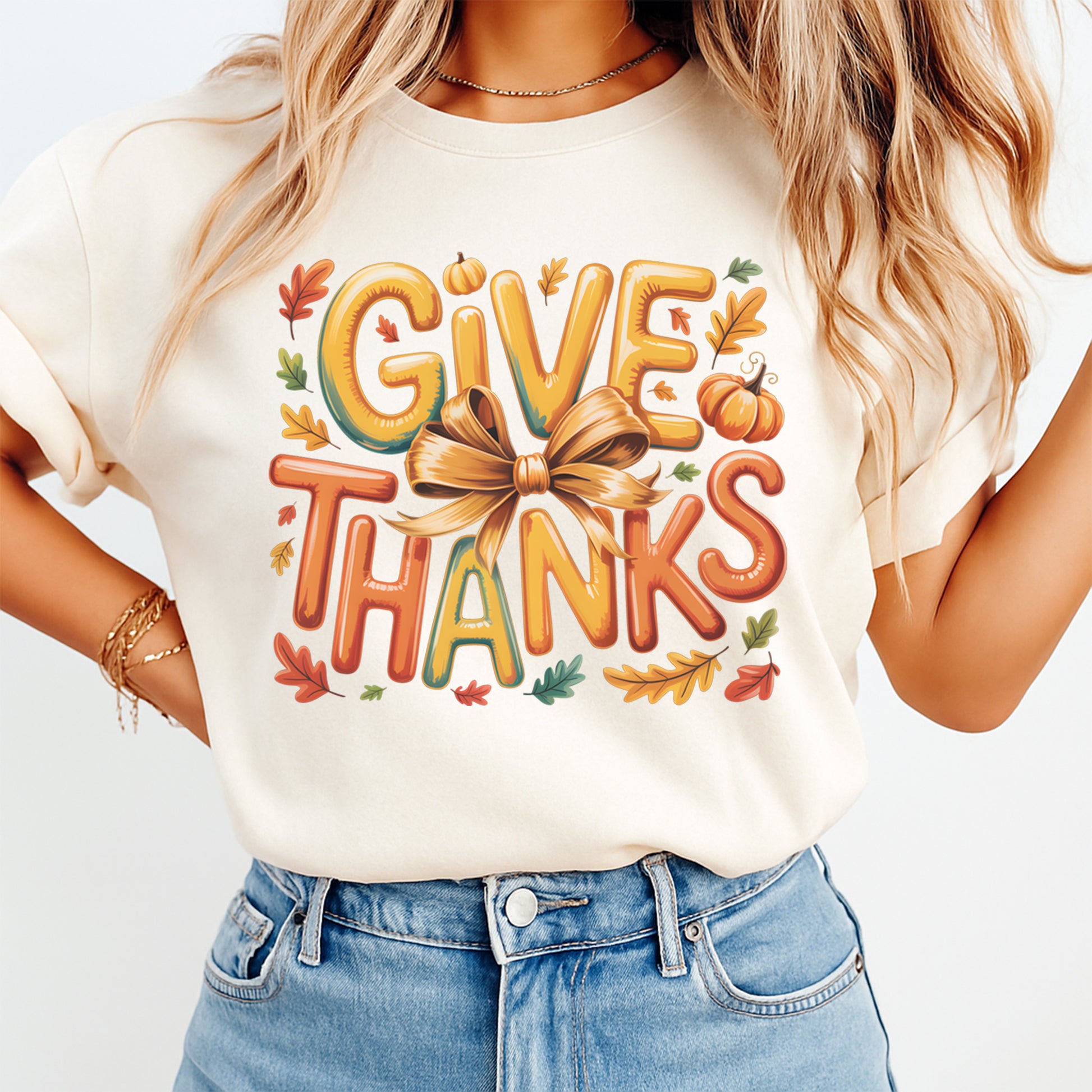 Thanksgiving Give Thanks Bow Lettering DTF Transfer – Ready to Press Iron On Heat Transfer for DIY Thanksgiving Shirts 12364