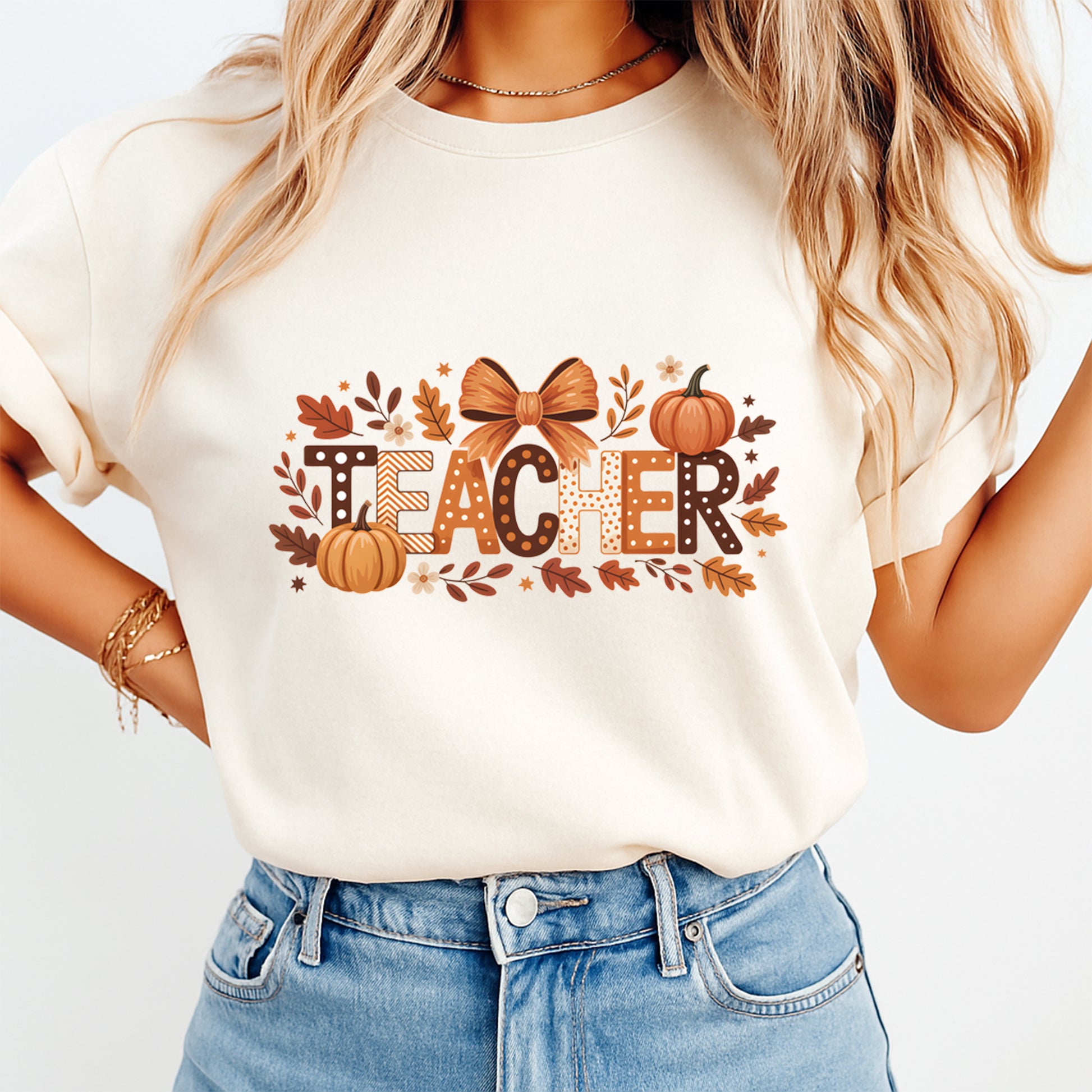 This ready to press Thanksgiving DTF transfer features the word “TEACHER” in fall patterned lettering with pumpkins, floral accents, warm leaves, and a large autumn bow. Designed especially for educators, this seasonal graphic is perfect for classroom outfits, school events, fall festivals, and Thanksgiving celebrations where teachers want to show festive spirit.