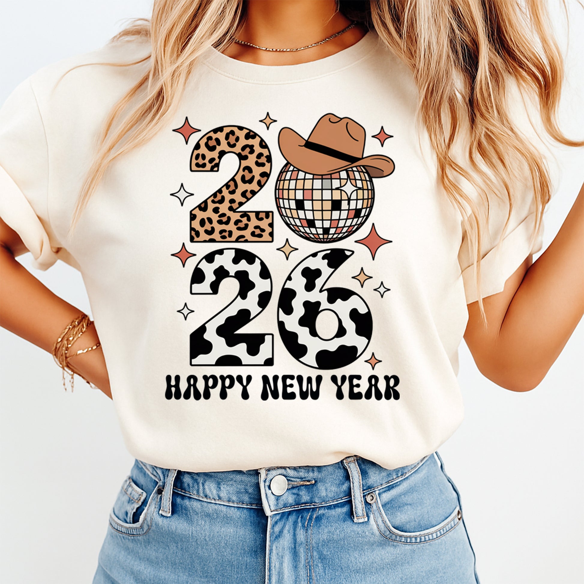 This ready to press New Year DTF transfer brings a fun western twist to 2026 with a mix of leopard print, cowprint numbers, a stylish disco ball wearing a cowboy hat, and sparkling accent stars. Strong western vibes meet festive New Year energy, making this design perfect for rodeo lovers, country-themed New Year’s Eve parties, boutique apparel drops, and DIY New Year shirts for small business sellers wanting a trendy cowgirl aesthetic.