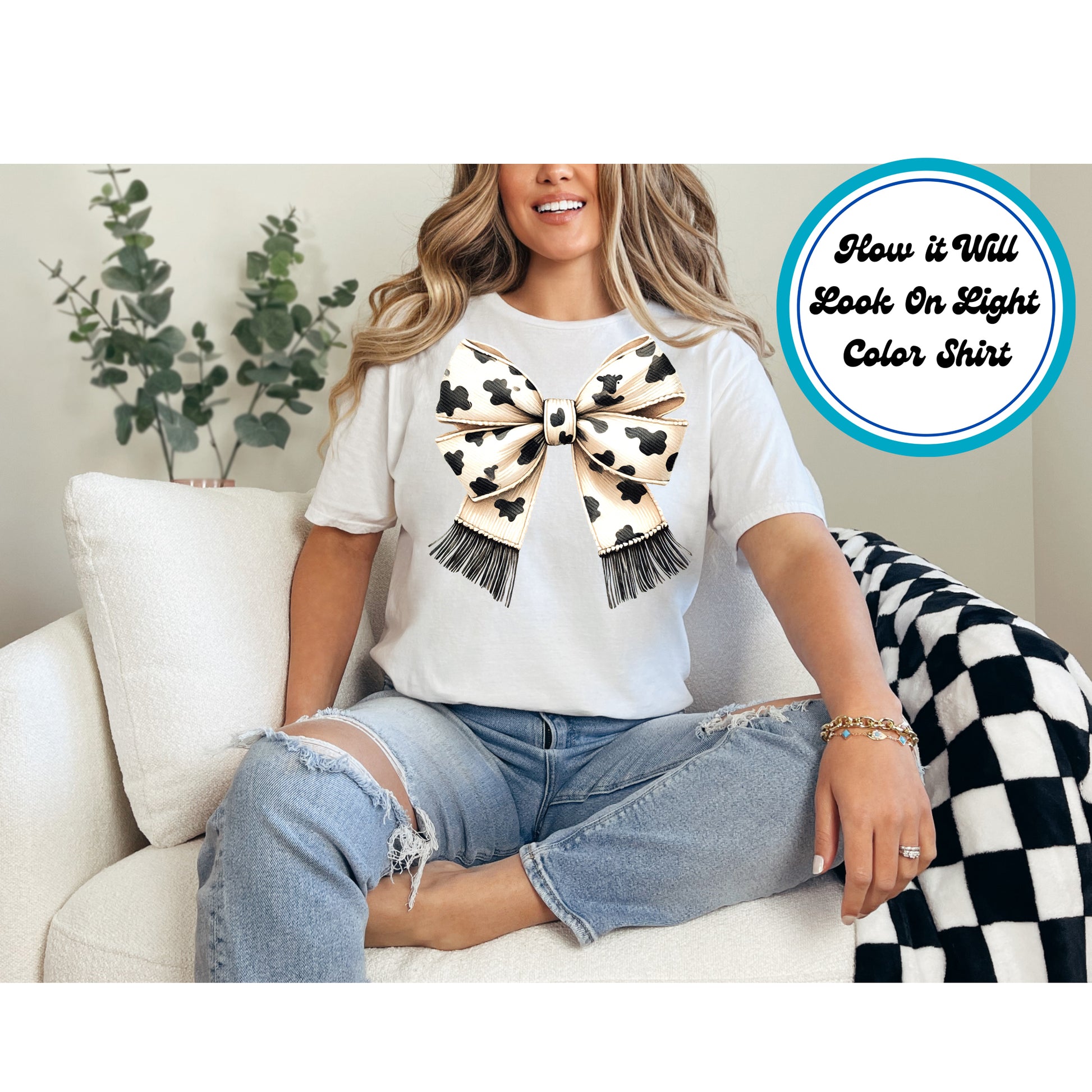Product Description: This stylish Western DTF transfer features a cow print bow with stitched details and black fringe accents. A perfect addition to cowgirl and rodeo-inspired apparel, bringing a rustic yet fashionable touch. High-quality print ensures crisp details and lasting durability.