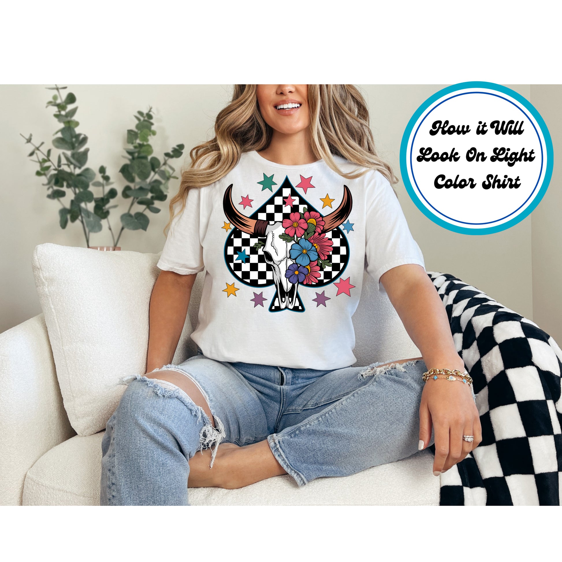 Product Description: Add a bold and colorful western touch to your apparel with this Floral Longhorn Skull DTF transfer! Featuring a detailed bull skull adorned with vibrant flowers, a checkered spade background, and scattered stars, this ready-to-press design is perfect for cowgirls, rodeo lovers, and western fashion enthusiasts. Great for customizing t-shirts, hoodies, and more!