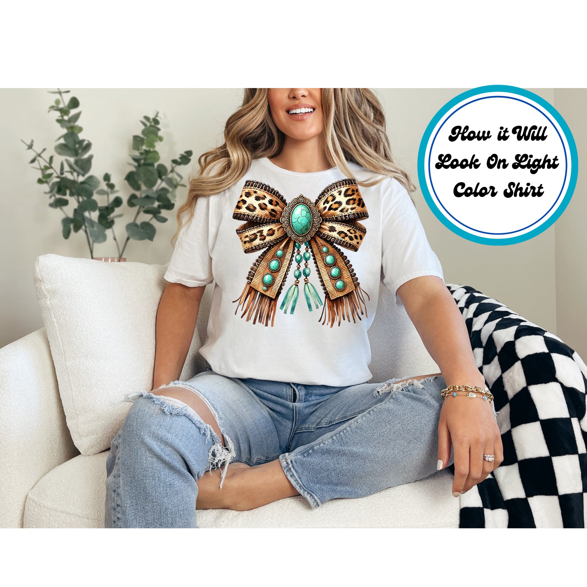 Product Description: This stunning Western-style DTF transfer features a bold leopard print bow adorned with turquoise stones, intricate beaded details, and fringe accents. A perfect addition to cowgirl and rodeo-inspired apparel, bringing a rustic yet glamorous touch. High-quality print ensures vibrant colors and durability.