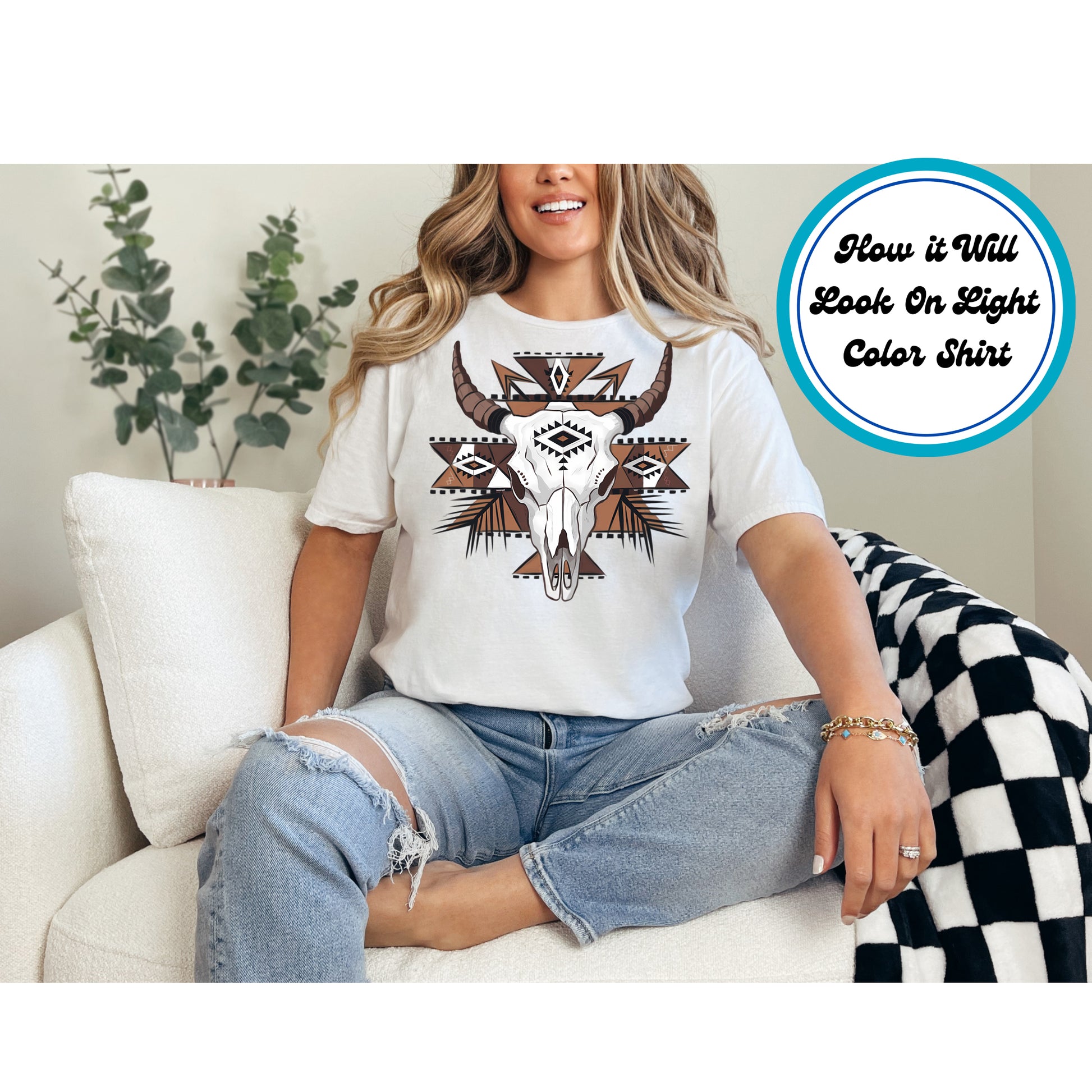 Product Description: Add a bold Southwestern touch to your apparel with this bull skull DTF transfer! Featuring a detailed longhorn skull with geometric tribal patterns, this ready-to-press design is perfect for western fashion, rodeo lovers, and rustic boho styles. Ideal for customizing t-shirts, hoodies, and more!