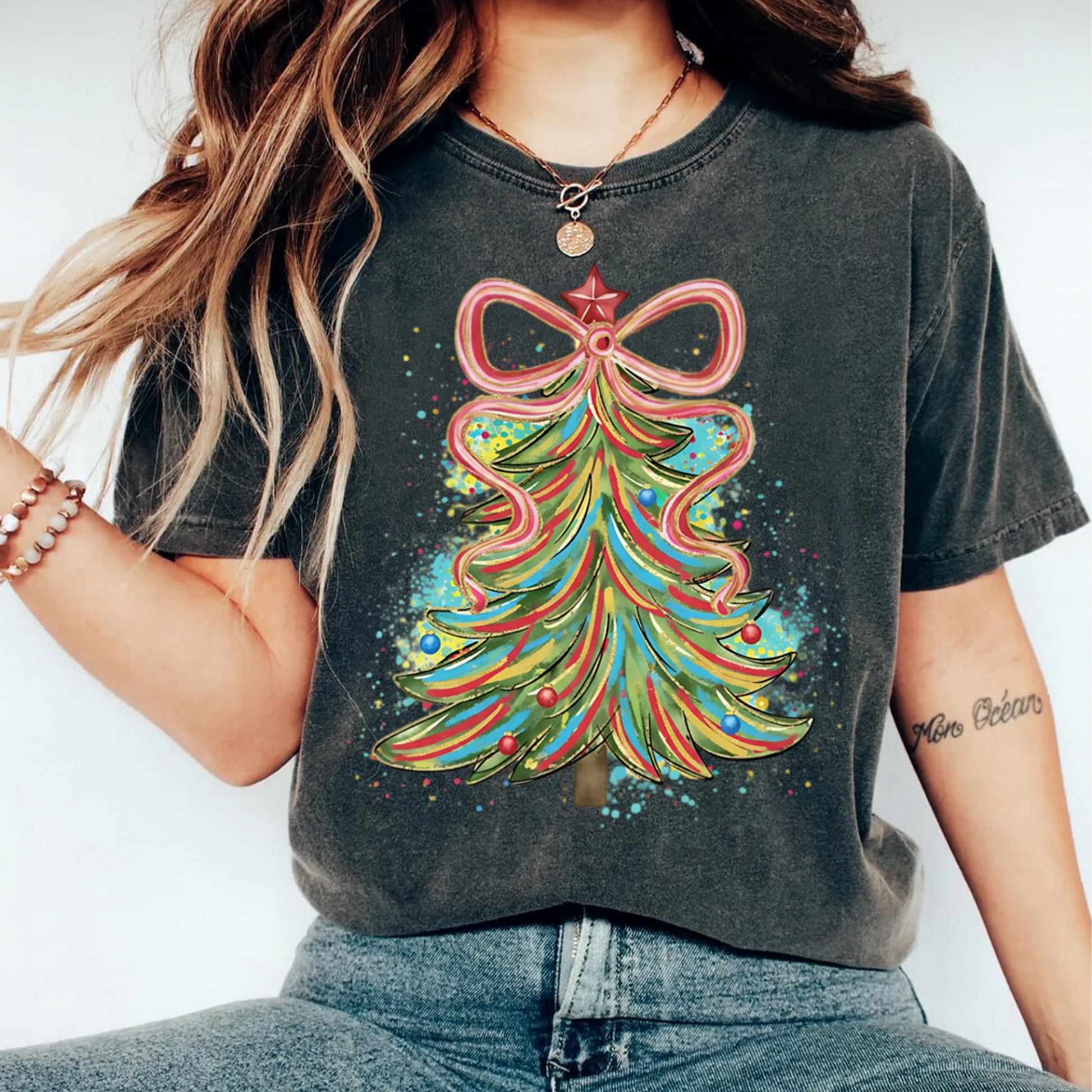 This ready to press Christmas DTF transfer features a whimsical Christmas tree with colorful ribbon-like swirls, bright ornaments, and a red star topper. The watercolor-style artwork adds a fun and artistic twist to traditional holiday apparel—perfect for festive shirts, small business holiday drops, or cozy seasonal collections.