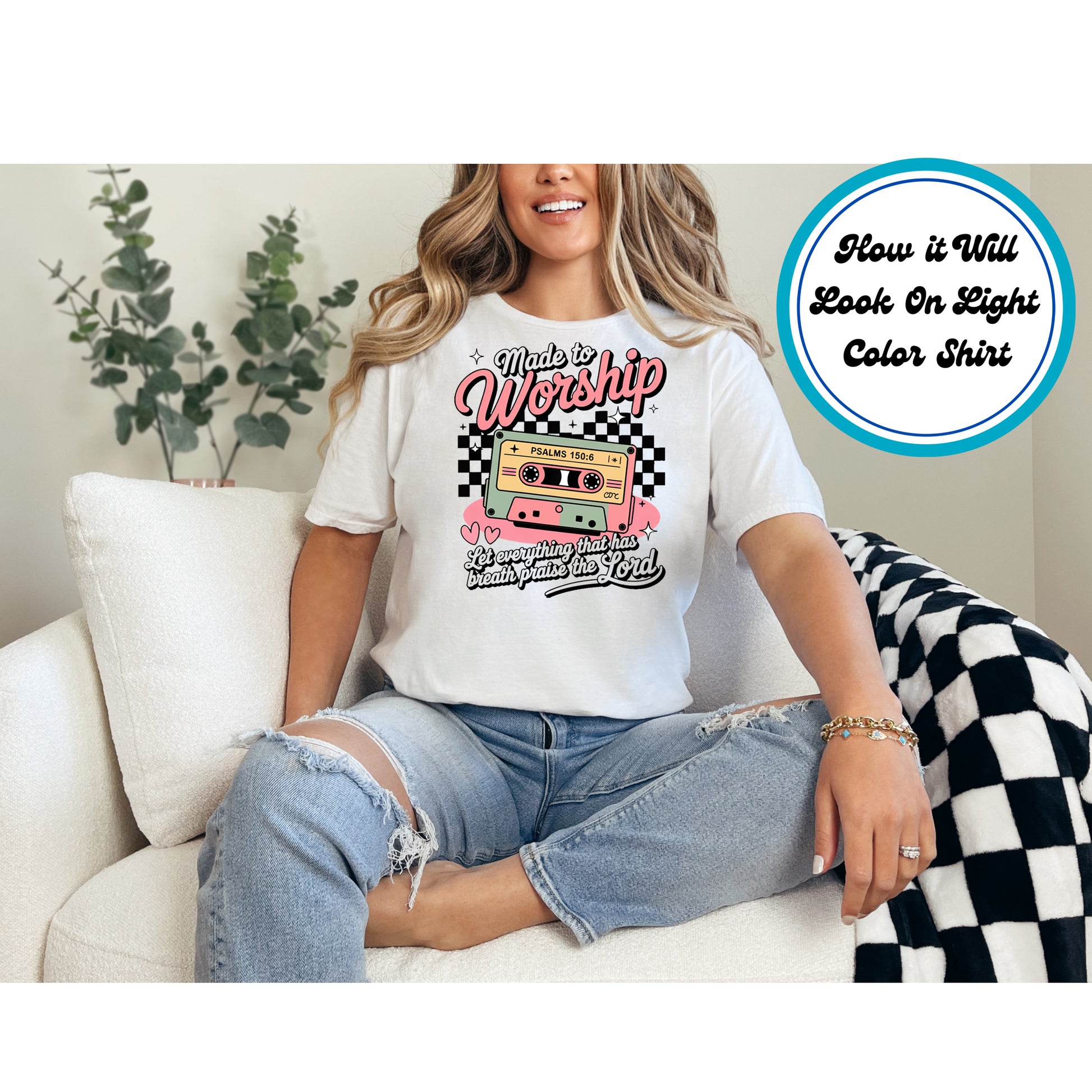 This ready to press dtf transfer features a retro worship vibe with a pastel cassette tape, checkerboard backdrop, and uplifting praise quote from Psalms 150:6. Designed in soft pinks, greens, and black for a nostalgic yet meaningful DIY shirt.
